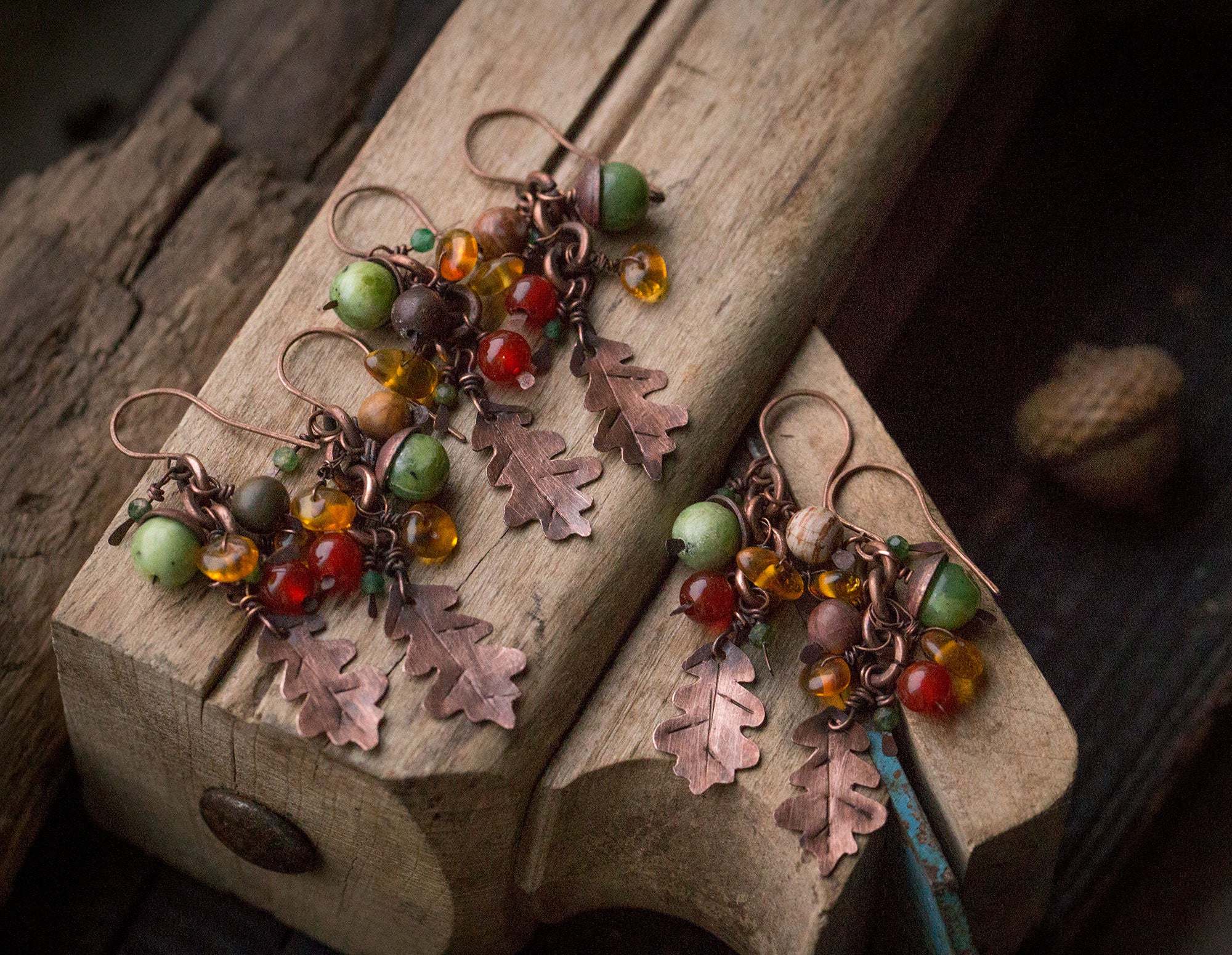 Kolczyki małe liście dębu z żołędziami, jesienne kolory